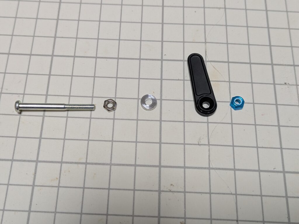 GFなんかのフレクションダンパー用の32mmビス(19805584)にナットつけて暴れないようにして、なんかわかんないアルミスペーサー入れて、3mmナットで止めてます。