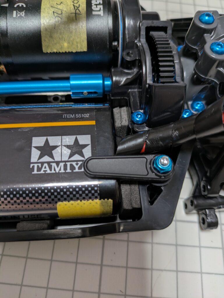重いものは中央に、ってことでバッテリーはシャシ中央に寄せていますが、この車はバッテリー側が軽くなっちゃうんでシャシの外側に置くのもいいと思います。