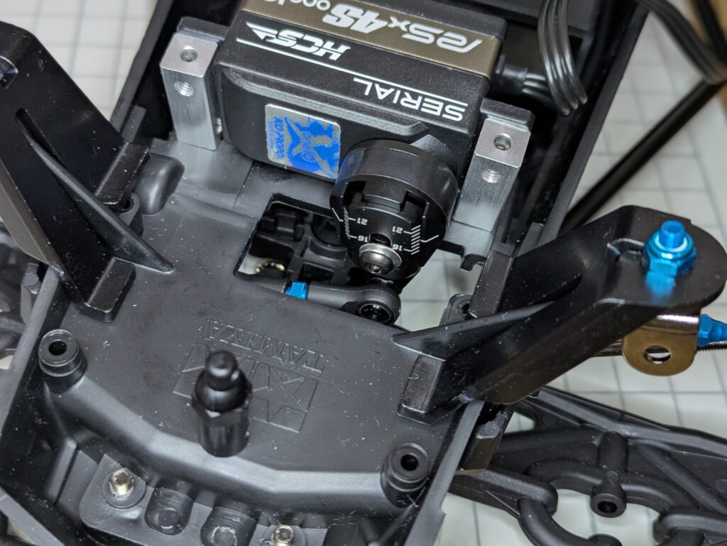 そんでOPのアジャスタブルサーボホーンつける、っていうセレブ仕様。18ミリでセットしてます。