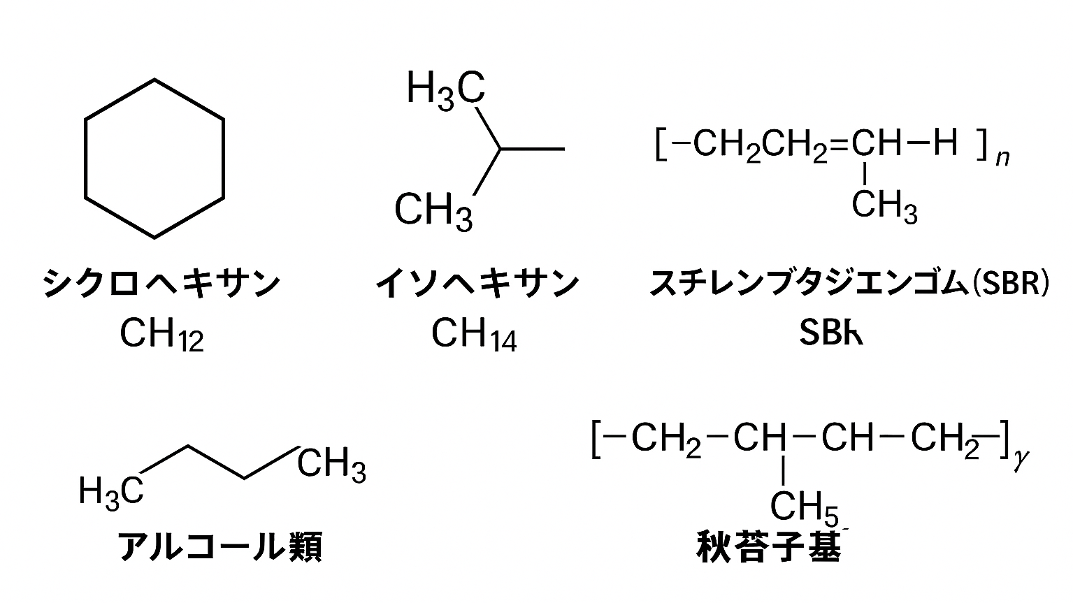 シクロヘキサンやイソヘキサンといった「炭化水素」の仲間。